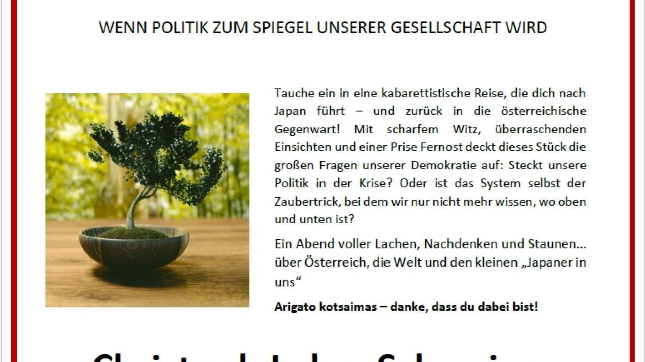 Tauche ein in eine kabarettistische Reise, die dich nach Japan führt – und zurück in die österreichische Gegenwart! Mit scharfem Witz, überraschenden Einsichten und einer Prise Fernost wird Christoph Lukas Schwaiger über sein Abenteuer im Japan berichten!